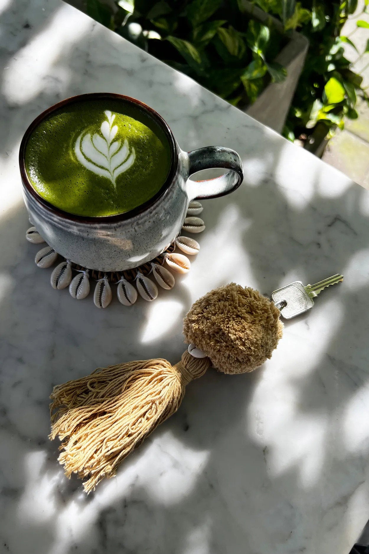 Experience boho luxe with a touch of the coast with this stunning Pompom keychain adorned with seashells and finished with a cotton tassel. Hang it on a wall hook in your entryway, above a doorknob, or on a curtain. Use it for styling or hang it on our metal keychain holder, also available here. This beautiful little accessory makes a great gift idea. Each piece is unique and truly one-of-a-kind. Color: Mocha. Dimensions: Width 6 cm, Length 21 cm. Materials: Cotton - Shells.